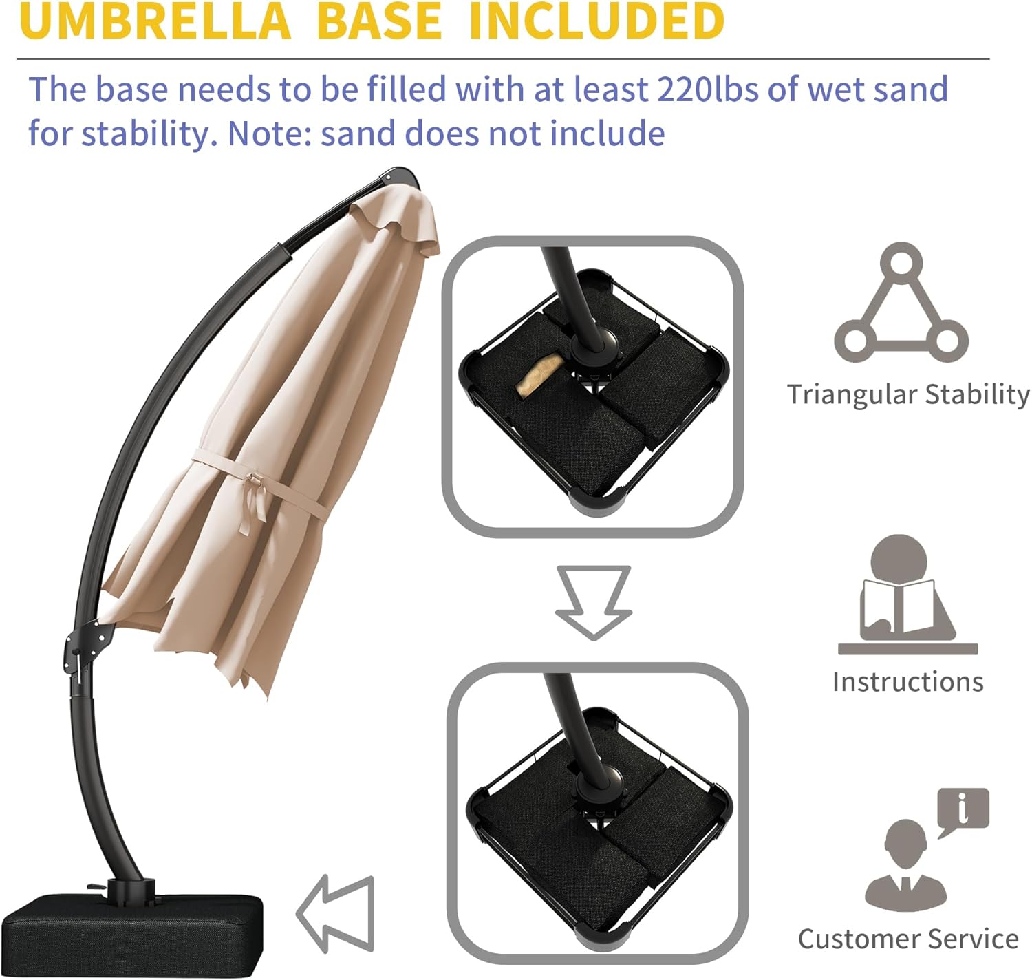 Notice for Base | The base must be filled with at least 220 lbs of sand. |