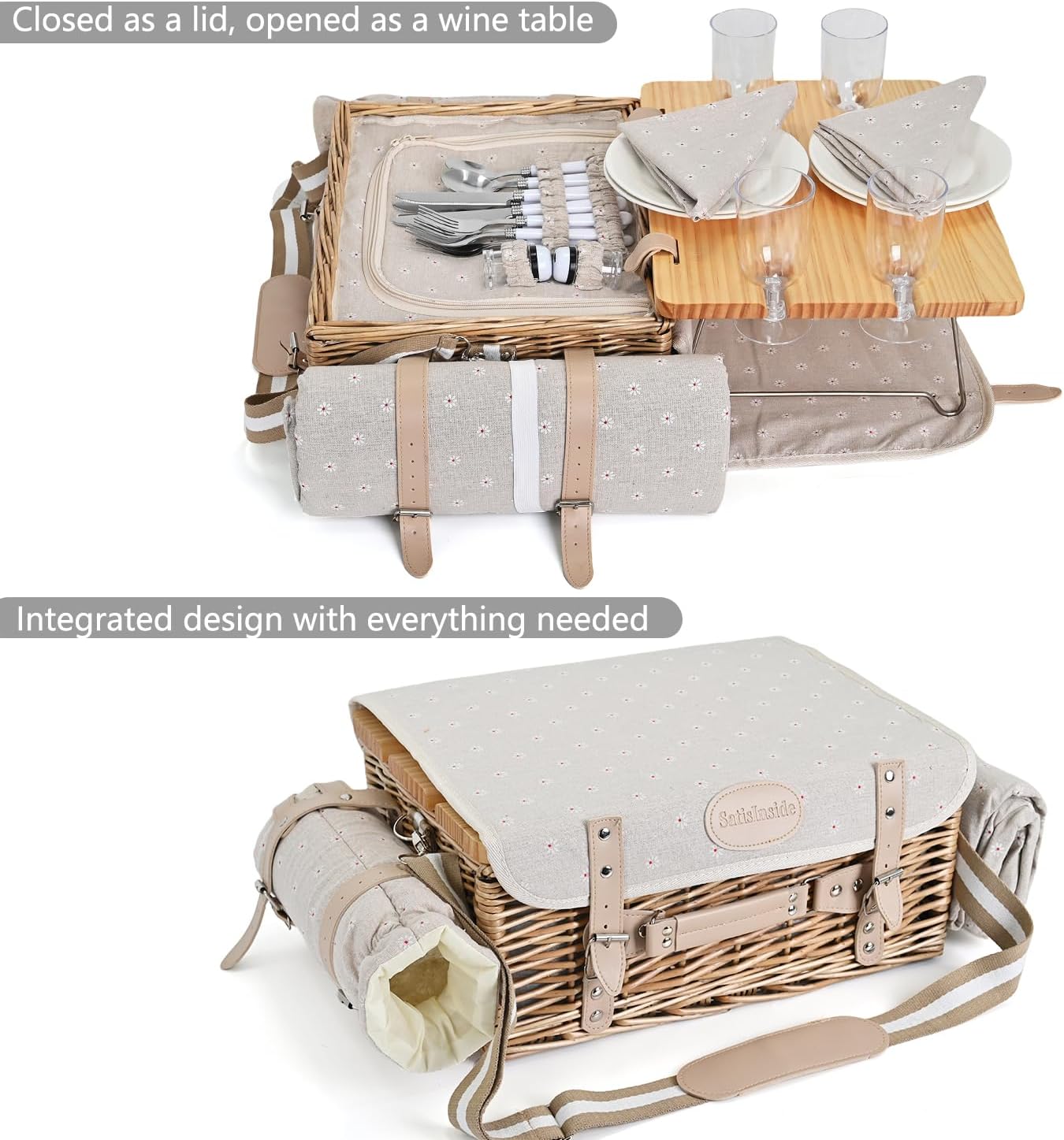 Multifunctional Wicker Picnic Basket Set for 4 with Blanket and Picnic Table, Insulated Picnic Set with Full Tablewares for Camping Outdoor Couples, Flowers