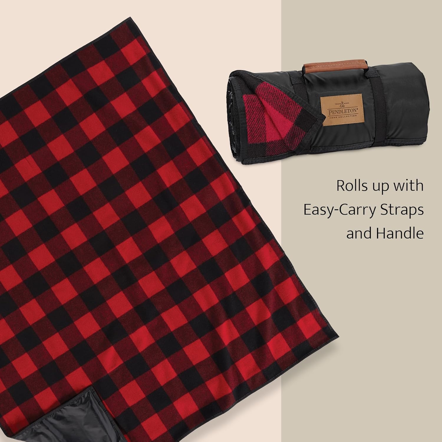 Pendleton Roll-Up Travel Blanket 60” x 70”, Durable Wool Blanket with a Waterproof Nylon Backing, Portable for Travel, Camping and Picnics with Leather Handle Grip and Patch